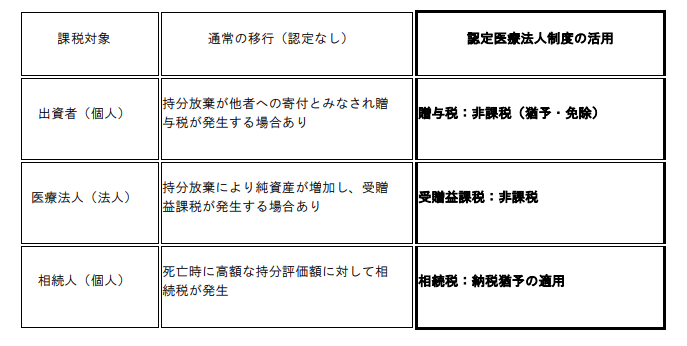 このリスクを解消するために国が設けたのが認定医療法人制度です。本制度は、厚生労働大臣の認定を受けることで、持分を放棄する際の贈与税を猶予・免除し、スムーズに「持分なし法人」へ移行させるための特例措置です。